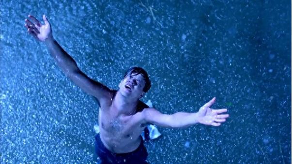 这个画面是男主借着电闪雷鸣的风雨夜,爬出隧道,奔向自由的画面