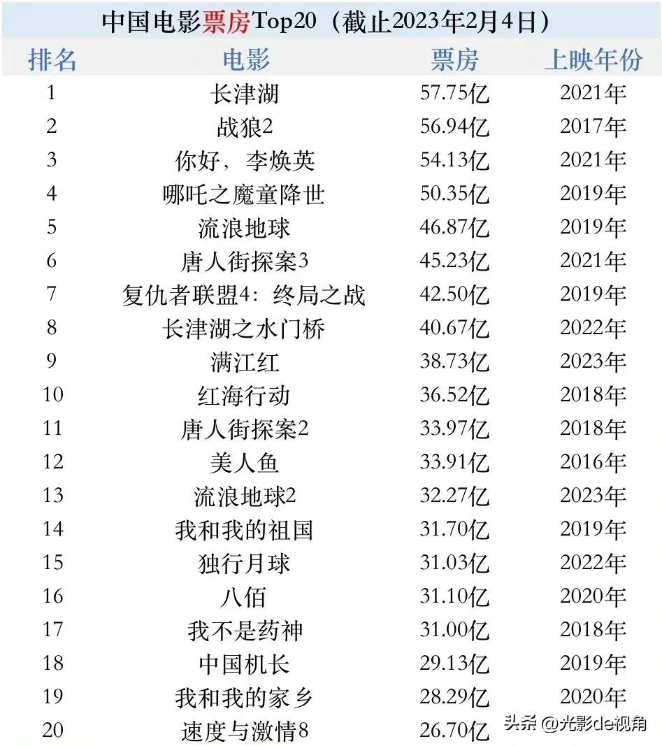 截止2023年2月4日,我国电影票房TOP20出炉,有4部电影票房超过50亿元,分别为《长津湖57.75亿》、《战狼2,56.94亿》、《你好,李焕英54.13亿》、《哪吒之魔童降世50.35亿》。这四部电影中,《战狼2》上映时间最早,为2017年,《长津湖》和《你好,李焕英》上映时间较晚,为2021年。