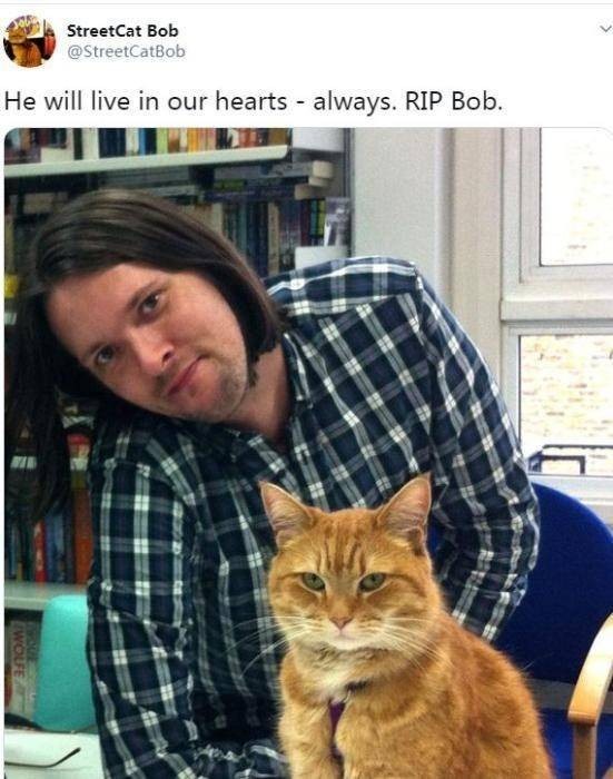 “鲍勃拯救了我,他给予我很多东西,不仅是陪伴,更是人生的目标和方向。我们的书和电影所取得的成功是个奇迹,他感动了无数生命,再也不会有一只猫像他一样了。我的生活从此失去了一道光,我永远不会忘记他。”