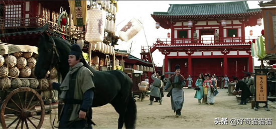 镜头从空中俯瞰繁华长安,顺着楼上的歌姬视线,落到地面,横穿长安市集,街市上有人正在挂起元宵节的灯笼,有人在卖各种吃食,跟随着官员的昭告天下,西市大门敞开,这一副盛唐景象,好似考古现场还原。