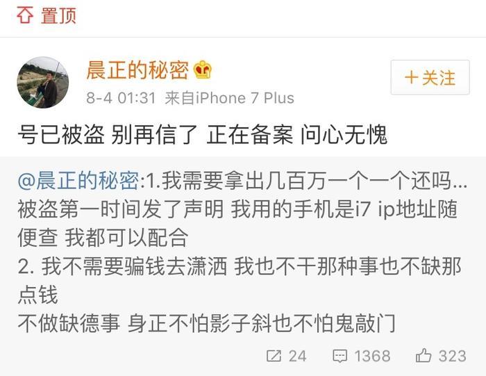 事情出来了以后,今天早上凌晨,他在自己的微博小号里发布了内容,讲自己被盗号,正在备案,问心无愧。