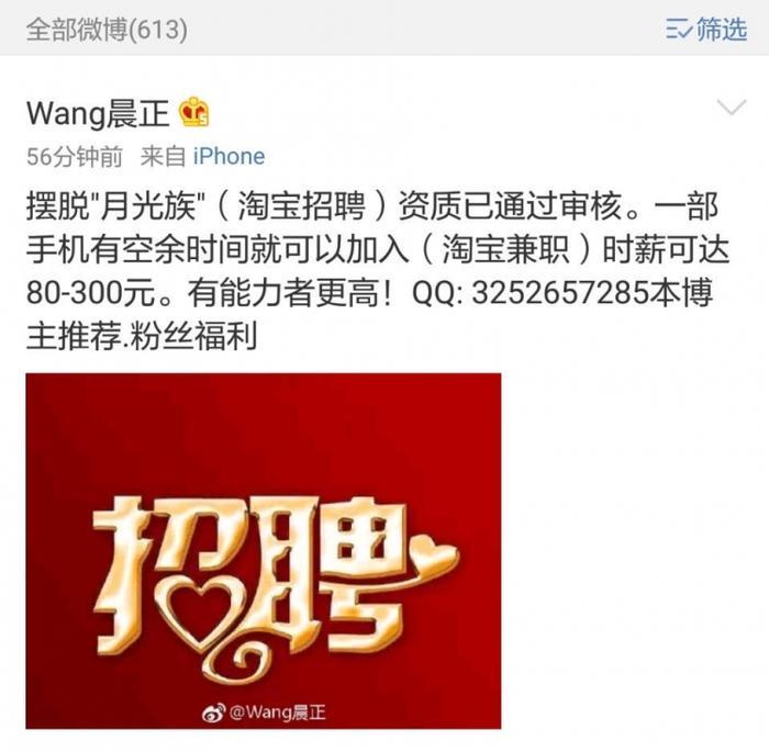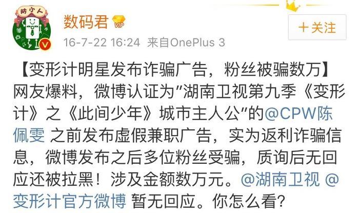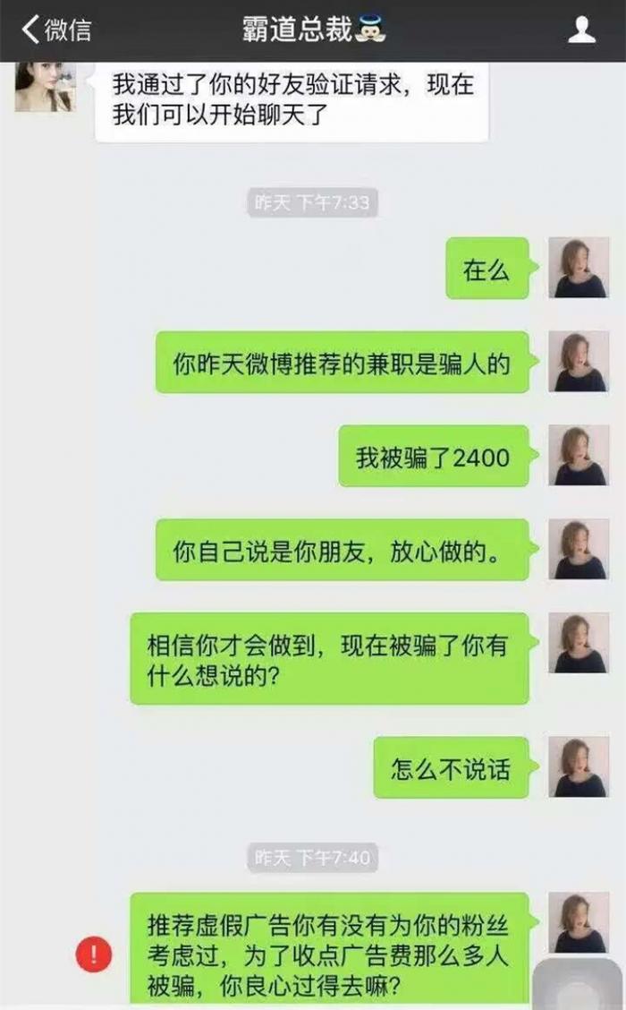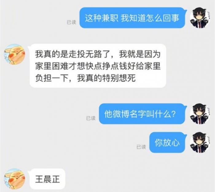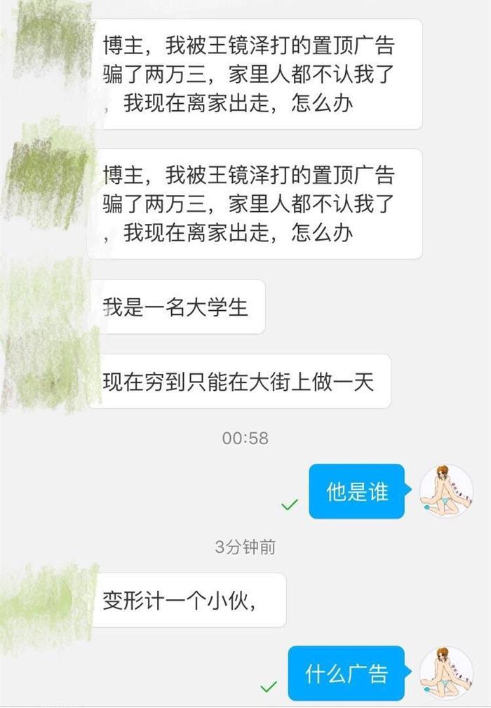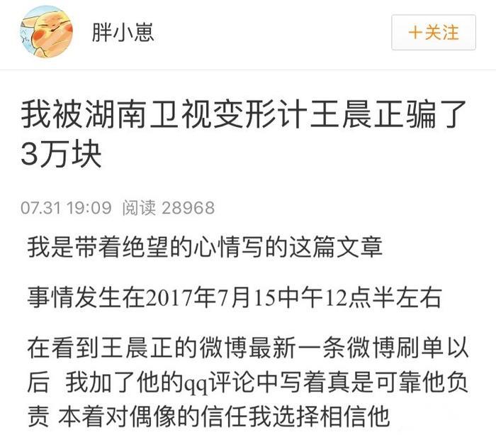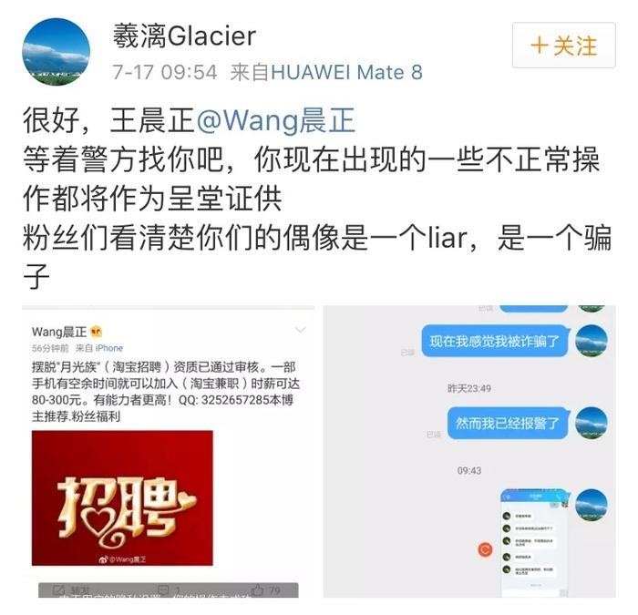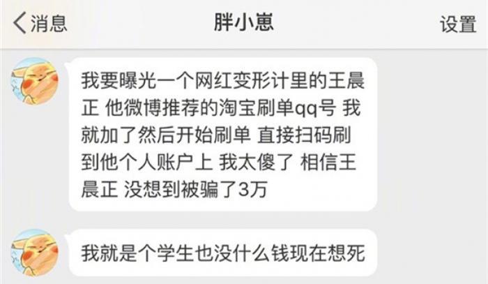 这条新闻的主角是曾经参加过《变形计》的王晨正,起因在他在7月15号发布了淘宝兼职刷单的一个广告,就有一位粉丝@小胖崽因为信任这位网红,加上急需用钱,就加了他说的QQ号,结果被骗走了3万块钱。