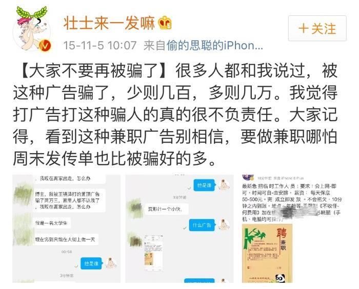 在微博搜索“变形计 诈骗”可以看到,除了这一位,还有好几位上了节目有了粉丝,开始接各种兼职诈骗广告。
