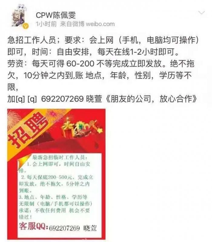 不过,通常这样的广告都不会留太久,等粉丝发现自己被欺骗,再转过头来微博举报,微博已经删除,再说自己被盗号就行,hin套路。
