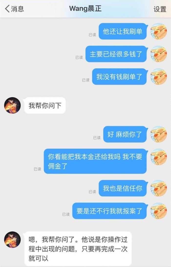王晨正联系了刷单的人,说帮忙问了刷单的人,没有问题,只是中间操作出了问题。