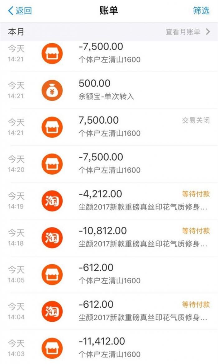 这是其中一张支付宝账单,能看到她在半个小时里支付了612、7500、11412各个不等额度的钱。