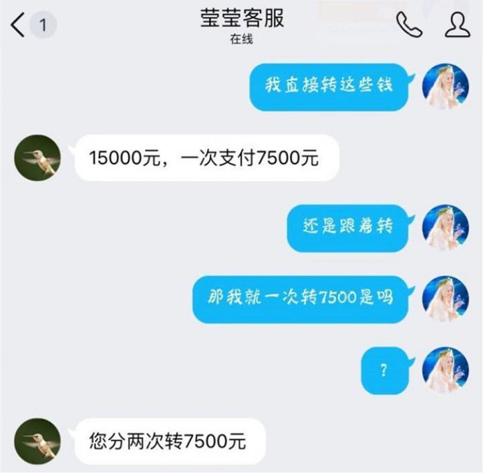 对面这位“莹莹客服”狮子大开口要一万五,这位网友虽然觉得有疑虑“我害怕你骗我”还是把钱转过去了。