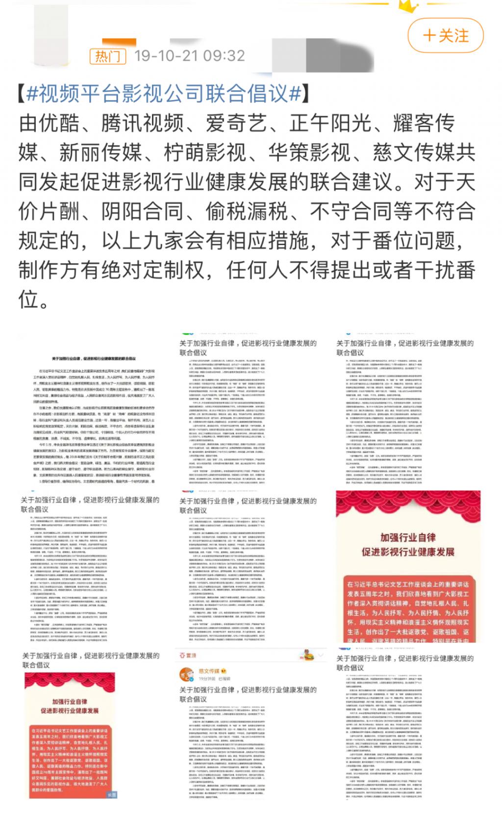 早在 2019 年 10 月,优爱腾三家平台和正午、华策、柠萌、新丽、慈文和耀客六家影视公司就发起过 " 联合倡议 ",倡议内容包含 " 抵制无理争番位 ",认为艺人番位排名权应由资方依合约决定。
