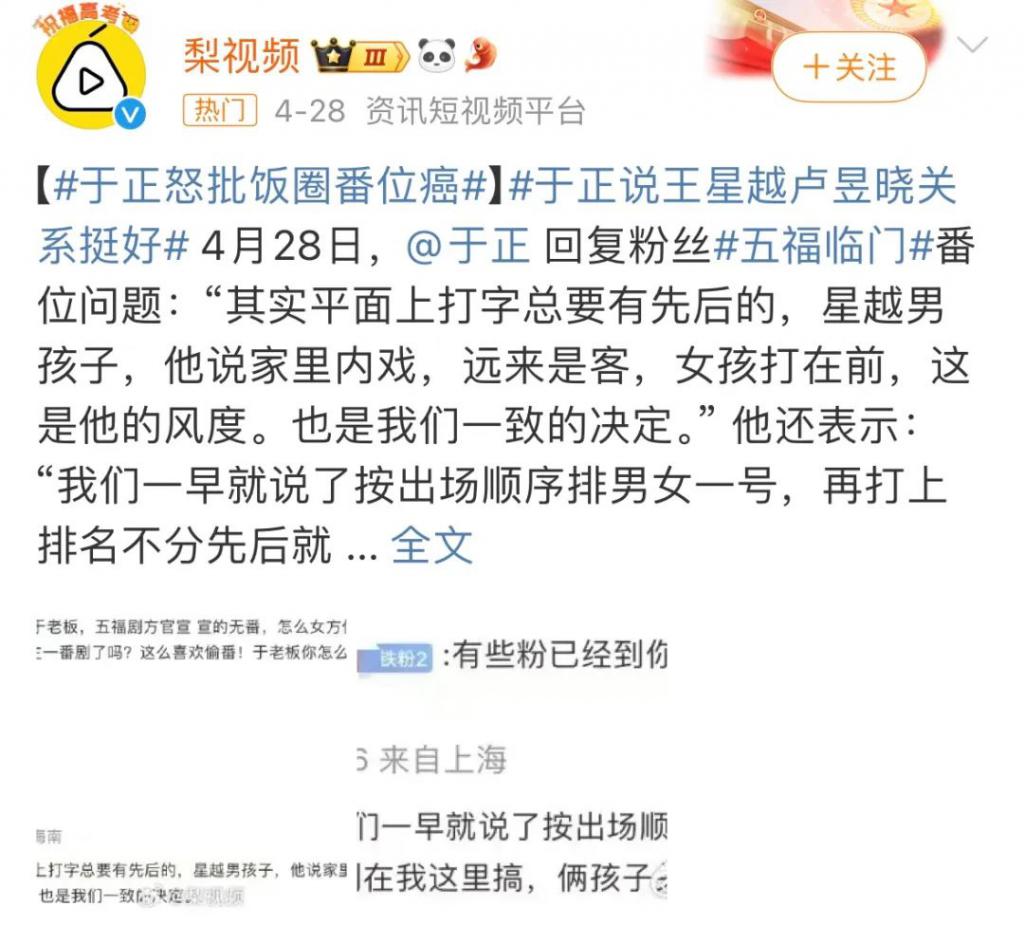 理论上讲,过往这类官宣信息出现时,几乎是默认番位按名字先后顺序决定,这也让两则 " 平番 " 热搜的出现和舆论场上围绕番位的争议显得有些莫名和可疑。但无论纷争因谁而起," 番位 " 都是敏感词,一旦被提出,就会陷入无来由、无结论的混战当中。