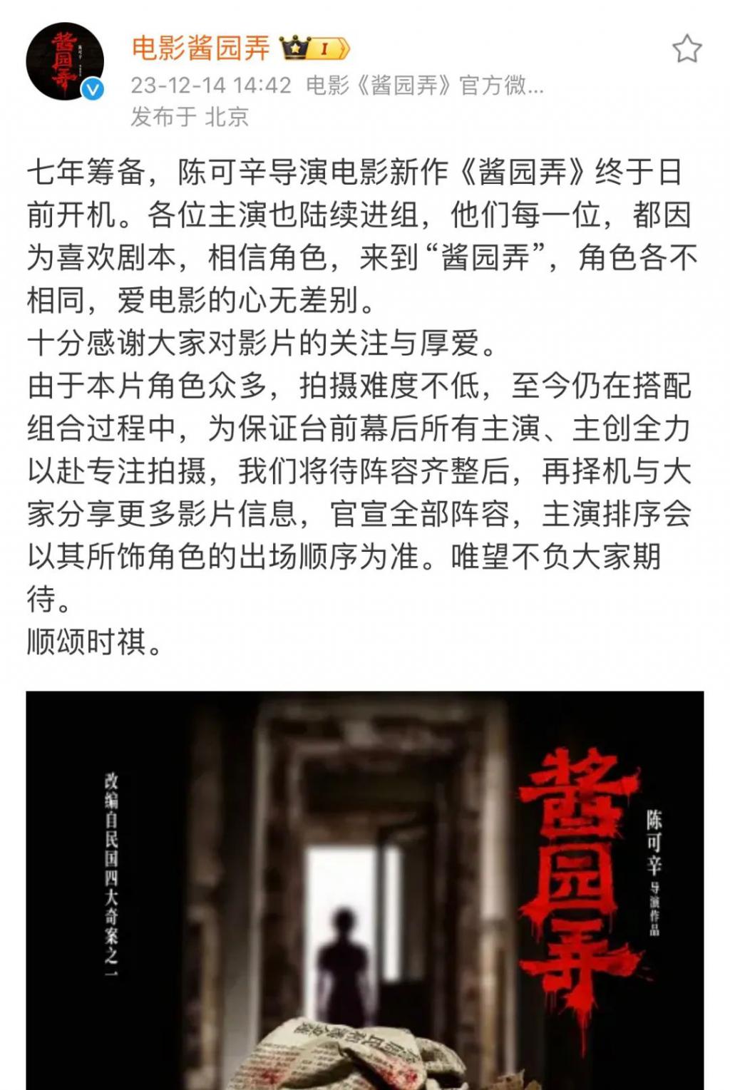电影《酱园弄》官方发布声明截图(图源:微博)