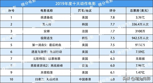 动作类电影,美国动作大片仍然最受全球观众喜爱,国产动作电影无一上榜,《疾速备战》拿下动作类电影最高评分,《勇敢者游戏2:再战巅峰》拿下动作类电影最高票房。韩国上榜的两部动作电影《恶人传》和《极限逃生》在国内很受欢迎。