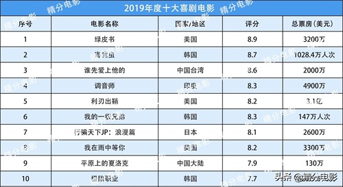 喜剧类电影,美国喜剧电影《绿皮书》虽然评分8.9分并拿下奥斯卡最佳影片、最佳原创剧本、最佳男配角三项大奖,但票房不高。韩国喜剧电影《寄生虫》可以说是2019年度韩国最佳电影,拿下最佳影片等4项重要奥斯卡大奖。