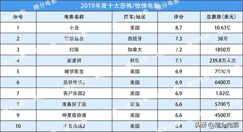 2019年度电影榜单,六大类电影(科幻、动作、动画、喜剧、恐怖/惊悚、爱情)共60部影片。其中美国电影32部,超过半数;韩国电影8部;中国大陆、日本电影各有6部,西班牙电影2部;法国、匈牙利、中国香港、中国台湾、加拿大、印度各有1部电影上榜。
