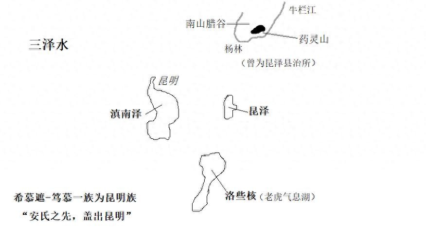 这三泽水即云南昆明周边的三个大湖:滇池、抚仙湖、阳宗海。阳宗海旁边的宜良县2000多年前就叫昆泽县。昆泽北部的嵩明是昆明族上古核心区。昆明滇池还有一个名称叫滇南泽,抚仙湖的彝名叫洛些核,直译为老虎气息湖,估计是湖上潮声类似虎吟。