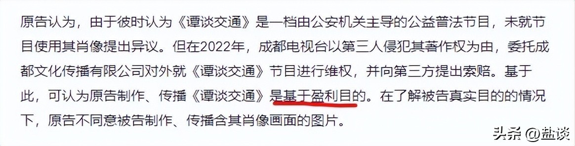 而最令人拍手叫好的,就是曾经的“路人”,那些被《谭谈交通》采访过的出镜市民的维权行为。那个提起诉讼的路人说,我被拍,如果是出于公益当然没问题,如果是作为商业用途,那抱歉,我要主张我的肖像权。
