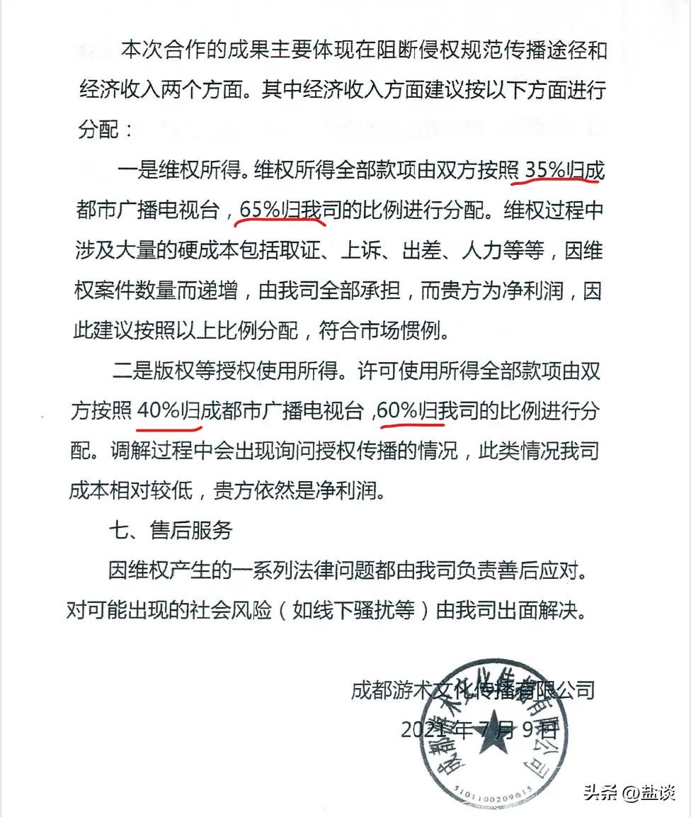 原来,2021年7月,成都广播电视台就和游术公司达成协议,授权游术公司对侵权行为进行调查、取证、起诉、调解、追款、商谈等。在相关方案中,双方就维权所得以及版权使用获得的收益按一定比例分账。这其中,就重点提到了《谭谈交通》。