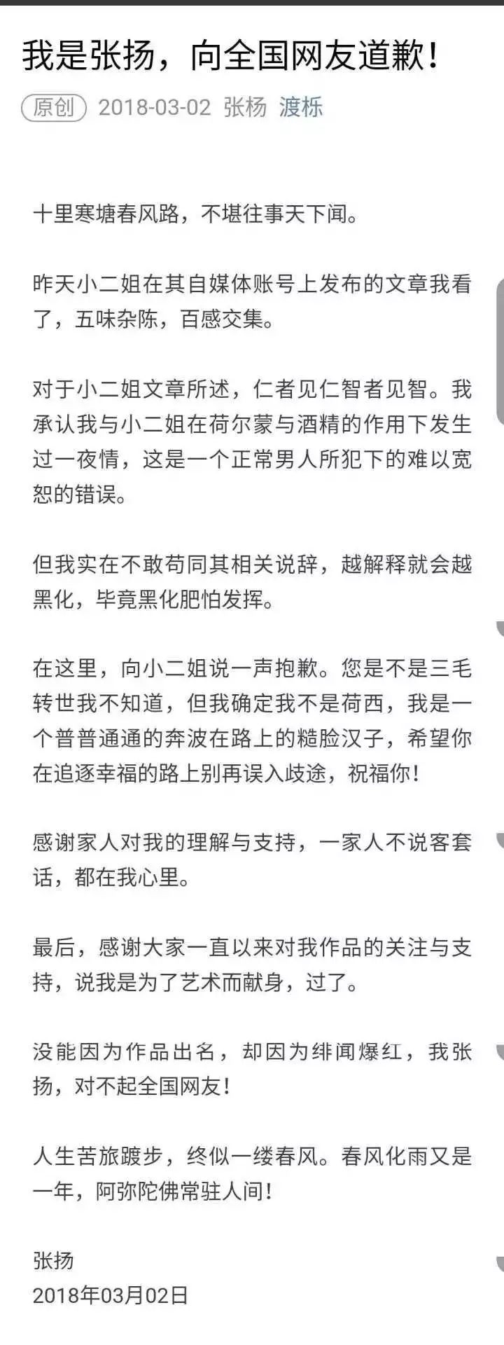 小二姐火了,她是谁呢,就是近日与导演张扬一夜情闹得非沸沸扬扬的女主角。关于与张扬的一夜情的事情闹得这么火,不是别人,正是她自己将这一事件广而告之的,并以一极美之词---不求结果的爱而被人热议。一篇《张杨导演,我爱你》让她火速从并不知名的公号写作者,瞬间成为网红,她与张扬的话题微博热搜榜排名第一。