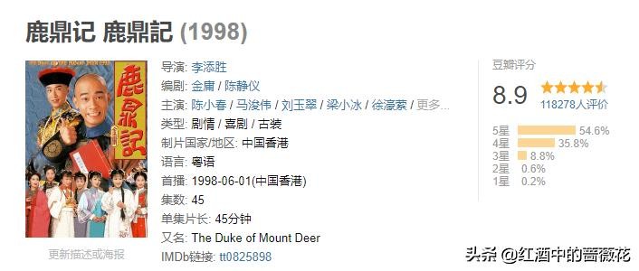 个人简评:在第三的位置上共有两部作品,分别是1997版《天龙八部》和1998版《鹿鼎记》,它们均由TVB出品,且评分人数大致相同。