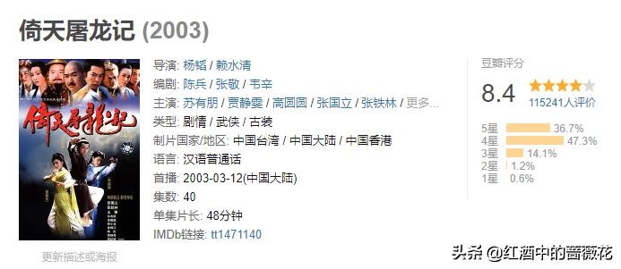 个人简评:03版《倚天屠龙记》绝对不是最遵循原著的一版,打斗场面也略显糊弄,但架不住人家的阵容庞大、演员颜值高啊。恐怕没有几个观众会面对苏有朋、贾静雯、高圆圆、陈秀丽、郭妃丽、陈紫函等俊男靓女不心动吧?再加上张国立、王刚、张铁林、徐锦江等老戏骨的精彩发挥,这部剧8.4的评分还是十分恰当的。