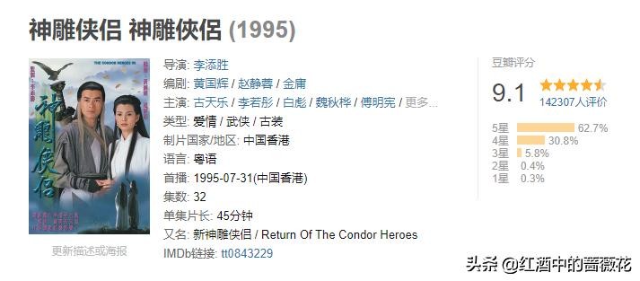 个人简评:写到这里,大家肯定猜到排名第一的是哪部作品了。没错,它就是TVB于1995年出品的古天乐、李若彤版《神雕侠侣》。