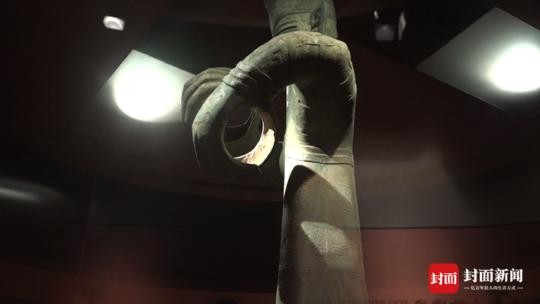 “青铜大立人的底座有四条腿,其形状就像大象的鼻子勾起来,象耳和眼睛都有。目前川内出土的最长象牙有1.85米,所以他的这个姿势合情合理。而且出土的时候,它就埋在象牙堆的底下。”这名工作人员说。