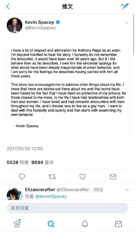 近日,演员安东尼·拉普在与BuzzFeed News做的访谈中控诉凯文·史派西曾在他14岁时对他进行了性骚扰,并称现在看到史派西仍会反胃。随后,凯文·史派西在推特上发表长文,宣布出柜。