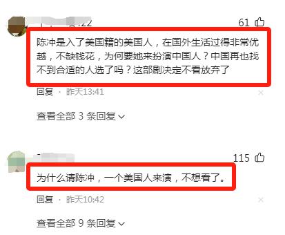此外,陈冲的国籍是大家最终弃剧的原因,纷纷表示:" 为什么请陈冲,一个外国人来演,不想看了 "。