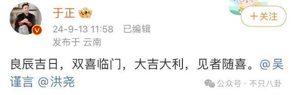俩人的老板于正第一时间送上祝福,并强调是双喜临门。(于正解释"双喜"指的是好友陆虎也是今天结婚。)