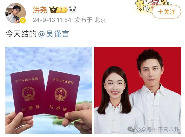 今天中午,吴谨言和洪尧突然官宣领证结婚,并且强调婚是今天结的,证是今天领的。
