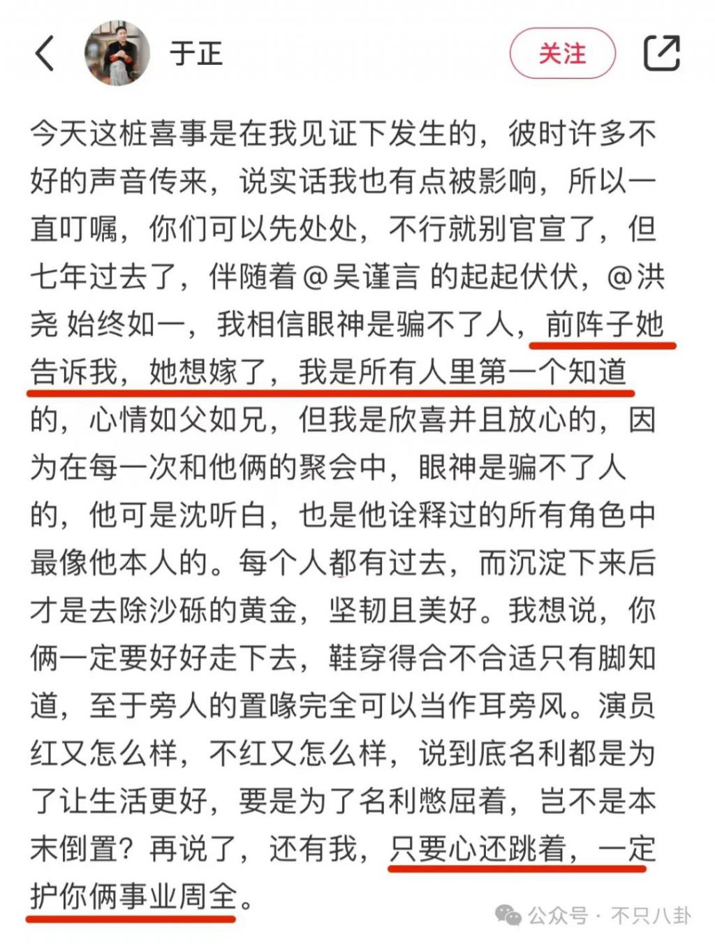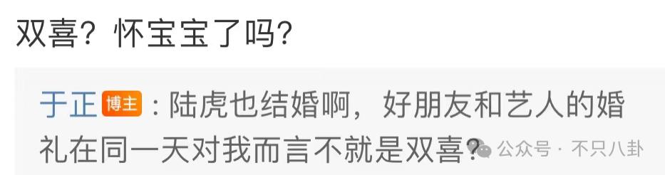 于正只说另一喜是好朋友陆虎结婚,并没有正面回应吴谨言是否怀孕。(按照于正的风格,如果怀孕是假的,岂不早就开骂了?)