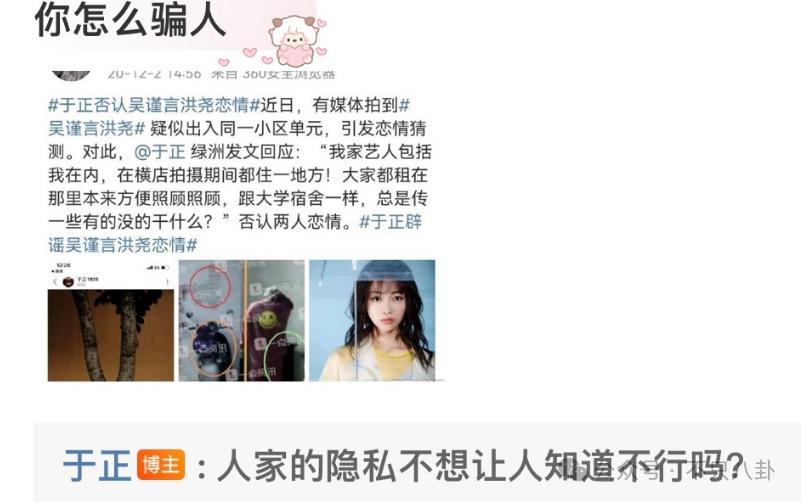 但于正还在嘴硬否认,说他家艺人在横店都住同小区,方便彼此照顾,"总是传一些有的没的干什么?"