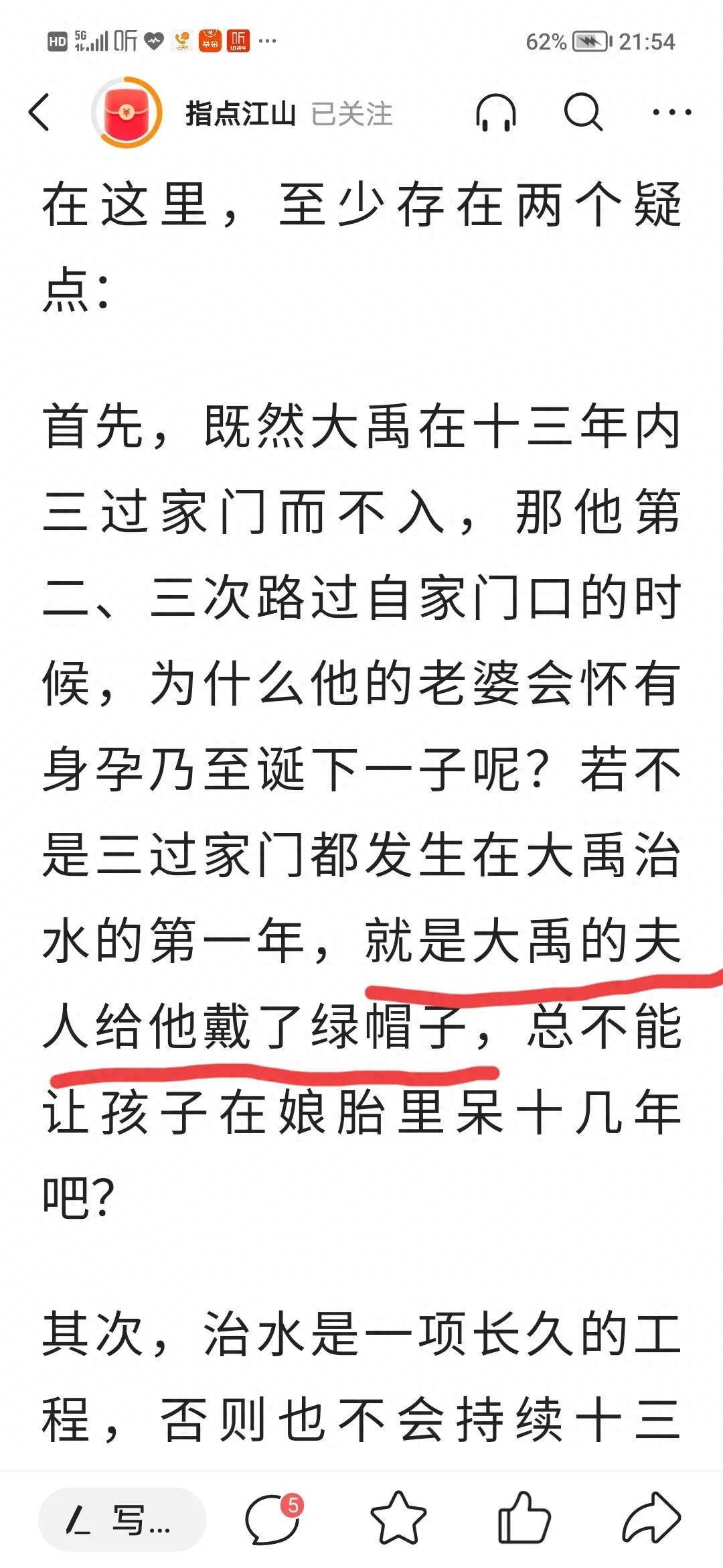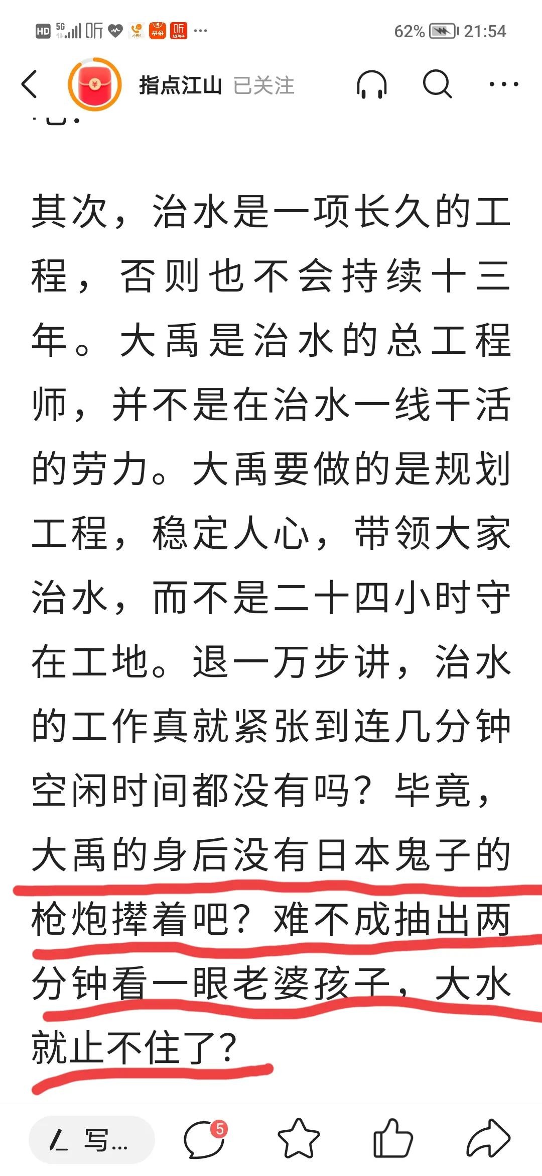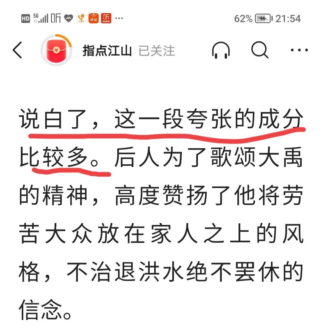 今天看到一篇奇葩的文章,大禹治水三过家门而不入是中国的传统历史故事,它影响了一代又一代华夏儿女,它告诉我们什么是舍小家顾大家,什么是公而忘私,可是就是这样一个发人深省、催人奋进的故事在有的人的嘴里却解读成了之所以大禹三过家门而不入是因为有人给他戴了绿帽子。这类人打着还原历史的旗号,行逐步蚕食甚至摧毁华夏文明的传承与根基之实,居心何其歹毒,典型历史虚无主义言论的代表。在这里,我提醒所有看到这类文章的朋友,一定要擦亮眼睛,辨别是非,不要人云亦云,平时多学习历史,树立正确的历史观。华夏文明需要你我来传承、发扬,而不是肆意篡改和诋毁,为我们的子孙后代留一片文化的净土吧!!