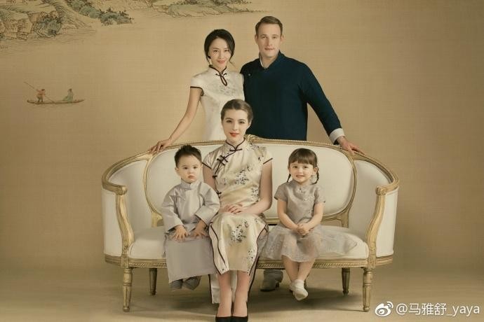 马雅舒今天在微博晒出一张全家福照片,其中有她的外籍丈夫和他前妻的女儿,一张现代照,一张古典风,一家人的颜值相当高。