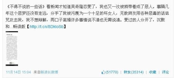 一时间马雅舒被传成一名“坏”女人,眼看愈演愈烈的舆论风向,马雅舒不得不特意开通了微博写了一篇长文来澄清此事,她在长微博里写到离婚时自己“没有多占吴奇隆一分钱,房子是两个人贷款买的,离婚时也把吴奇隆那一份如数奉还了,”而媒体所报道的“100万人民币和6栋千万豪宅作为赡养费,纯属子虚乌有,更别说现在吴奇隆现在还寄钱给自己。”在微博的最后,马雅舒还祝福了吴奇隆和刘诗诗。