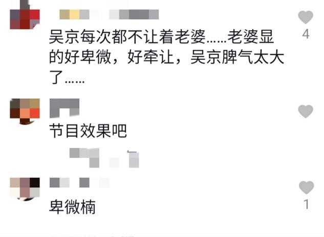 还有很多网友都觉得谢楠有些委曲求全,有网友表示"吴京每次都不让着老婆,谢楠显得好卑微谦让",不过也有网友发表自己的看法称这大概是节目效果。