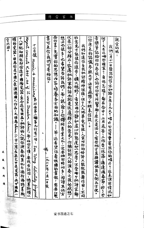 1957年7月至1959年10月之间,傅雷都没有给傅聪写信,从父子两之间因政治观念稍显不同而出现分歧,到傅聪出走英国,傅雷被打右派,这段时间里只有身为母亲的朱梅馥还在维系着和儿子的书信往来,告知家中的情况,试图调解父子矛盾。