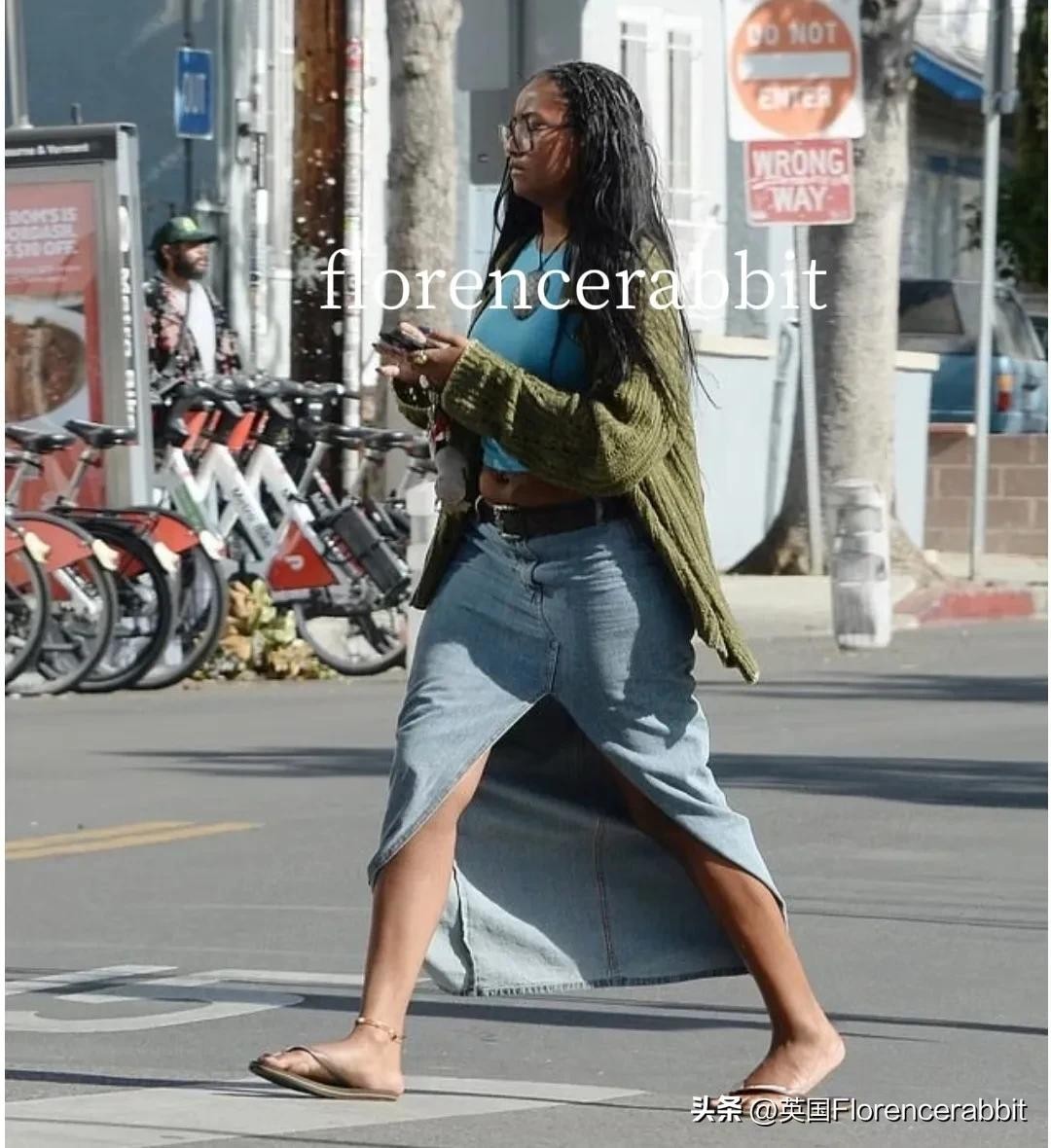 这位前总统的女儿身着休闲,绿色开衫、蓝色上衣配开叉牛仔裙。她在洛杉矶独自出门时一直眉头紧锁,不时瞥一眼手机。