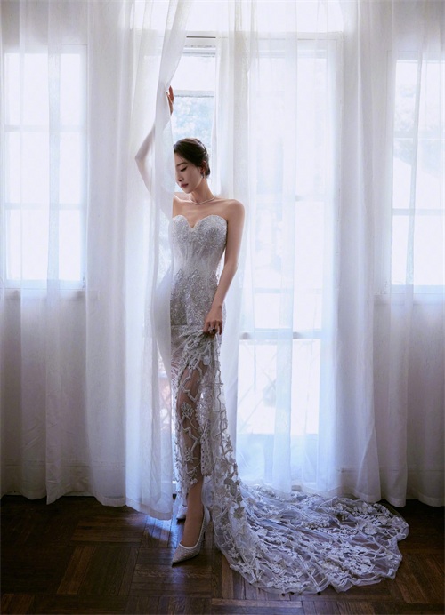 鱼尾裙的下摆设计流畅而自然,随着她的每一个步伐优雅摇曳,仿佛在诉说着她的独特魅力。这样的造型既突显了她的女人味,又不失高贵气质,让人一见倾心。