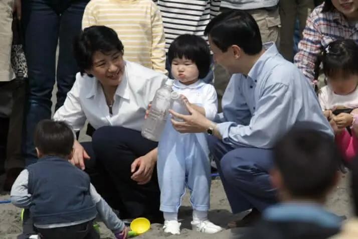 2003年4月,一岁半不到的爱子公主在父母的陪伴下与民众在沙滩玩耍,憨态可掬。