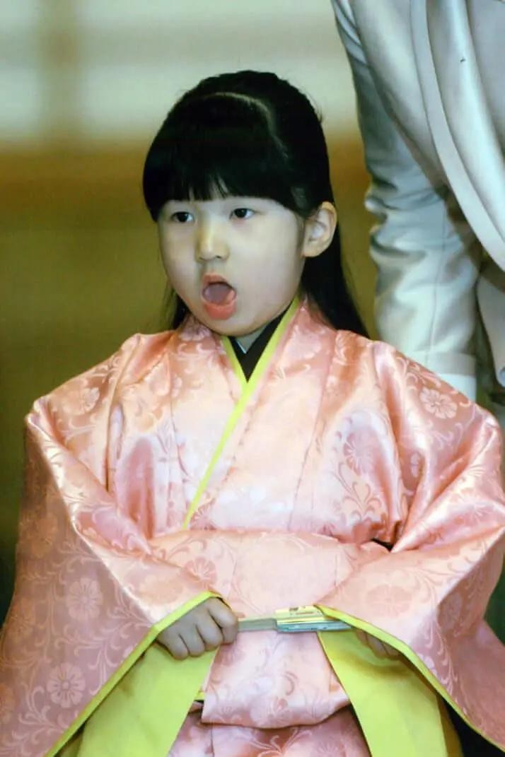 2006年11月,将要出席皇室活动的爱子公主,在工作人员的帮助下好不容易穿好了礼服,调皮地做起了鬼脸。