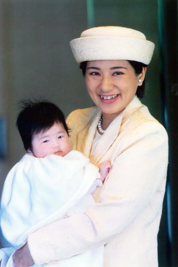 2002年3月,刚出生三个多月的爱子公主在母亲雅子的怀抱中,参拜位于东京皇宫内的贤所皇灵殿神殿。
