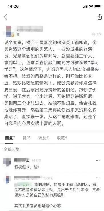 有人说吴秀波曾经睡了女友寝室的所有姑娘,有的说曾看见吴秀波到横店就要找妹子。