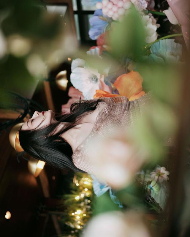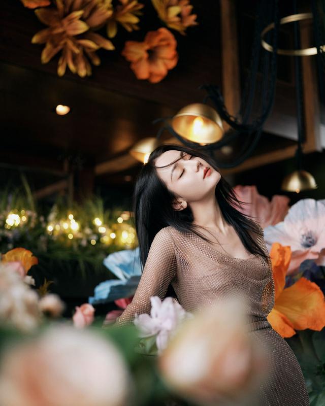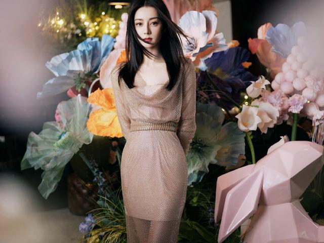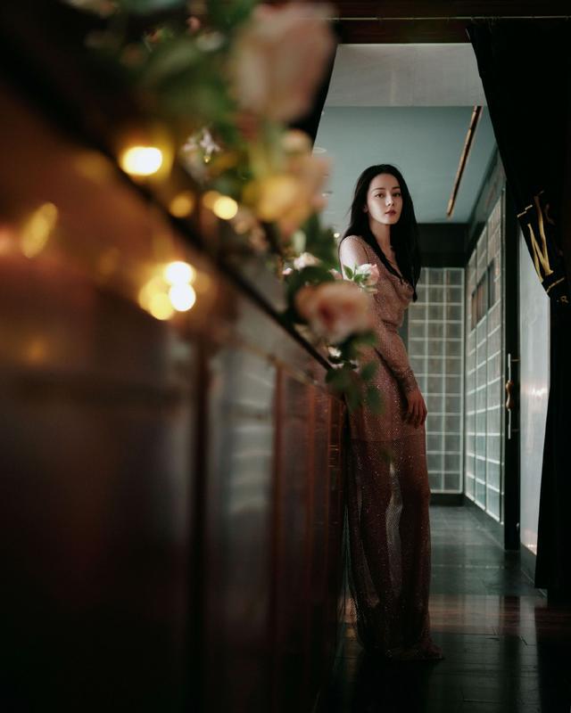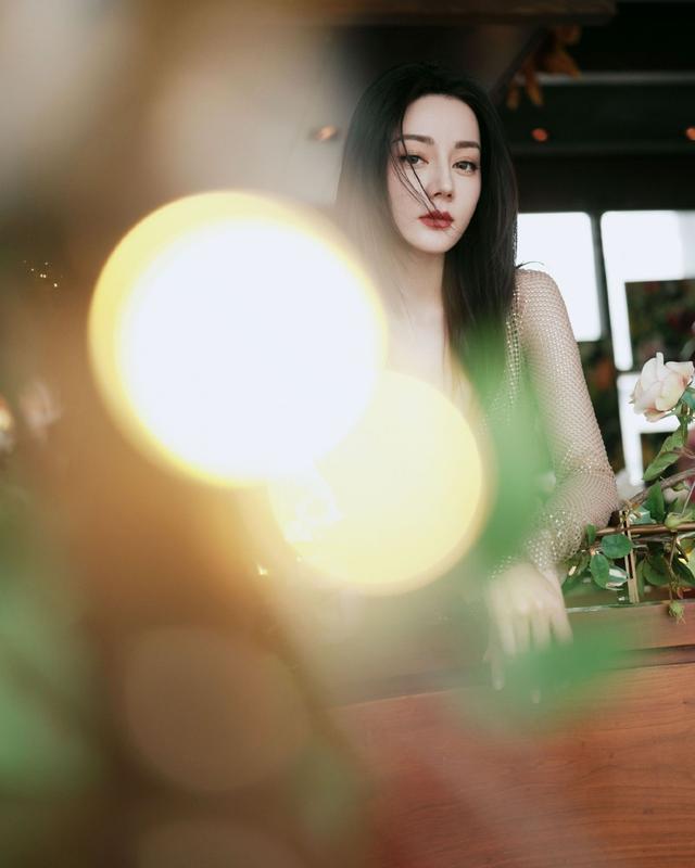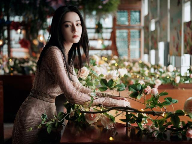 迪丽热巴繁花间拍写真,一袭水晶满钻连衣裙娴静优雅