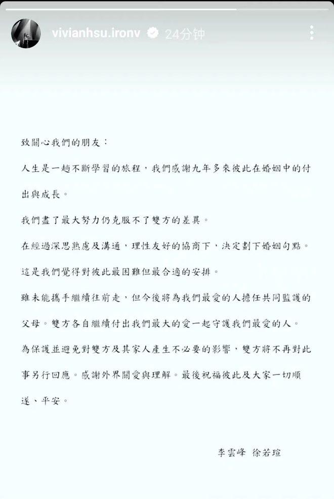此前,台湾《镜周刊》称离婚原因是:个性不合加上工作关系长期分隔两地。