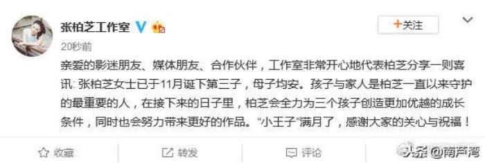没想到今天张柏芝工作室正式出面发声,承认张柏芝已经诞下第三个孩子。在微博配文道:母子平安…"小王子"满月了!