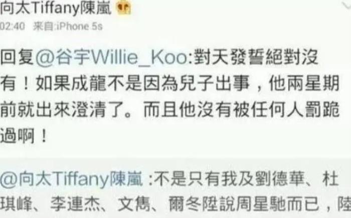 向华强的太太也在微博上辟谣说:“对天发誓绝对没有,而且成龙要不是因为儿子出事,他两星期前就出来澄清了,而且他没有被任何人罚跪过啊。