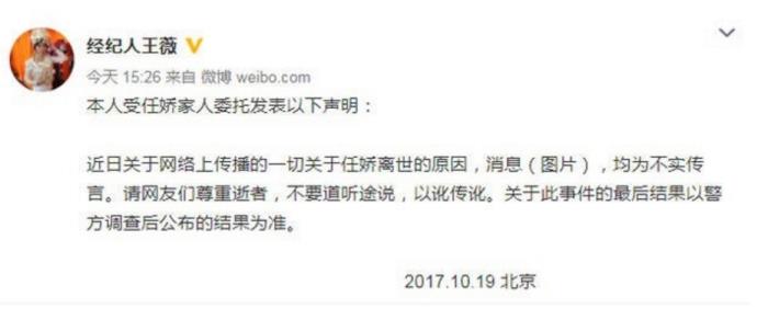 对于网上留言不断,时隔1个月后,最新调查结果显示,任娇属于醉酒后意外身亡,任娇经纪人王薇受其家人委托在微博上发表声明,称:“近日关于网络上传播的一切关于任娇离世的原因,消息(图片),均为不实传言。请网友们尊重逝者,不要道听途说,以讹传讹。”表示关于此事件的最后结果以警方调查后公布的结果为准。
