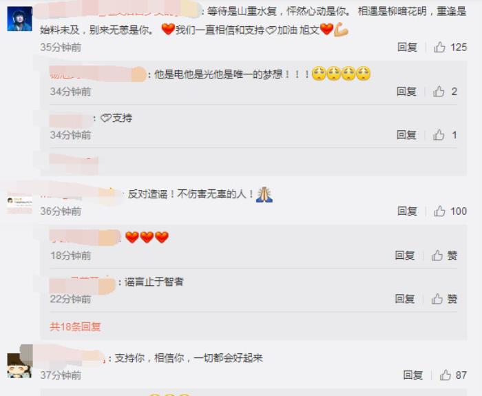 不少网友看到后纷纷评论道:“等待是山重水复,怦然心动是你。 相遇是柳暗花明,重逢是始料未及,别来无恙是你。 我们一直相信和支持,加油旭文”;“反对造谣!不伤害无辜的人!;“支持你,相信你,一切都会好起来”;“:尊重逝者 谣言止于智者 支持文锅 ”。