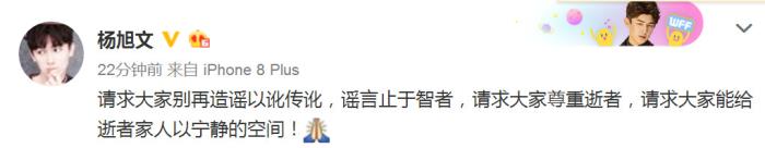不仅杨旭文工作室发表声明,面对任娇调查后续,杨旭文本人今天下午也回应道:“请求大家别再造谣以讹传讹,谣言止于智者,请求大家尊重逝者,请求大家能给逝者家人以宁静的空间!”