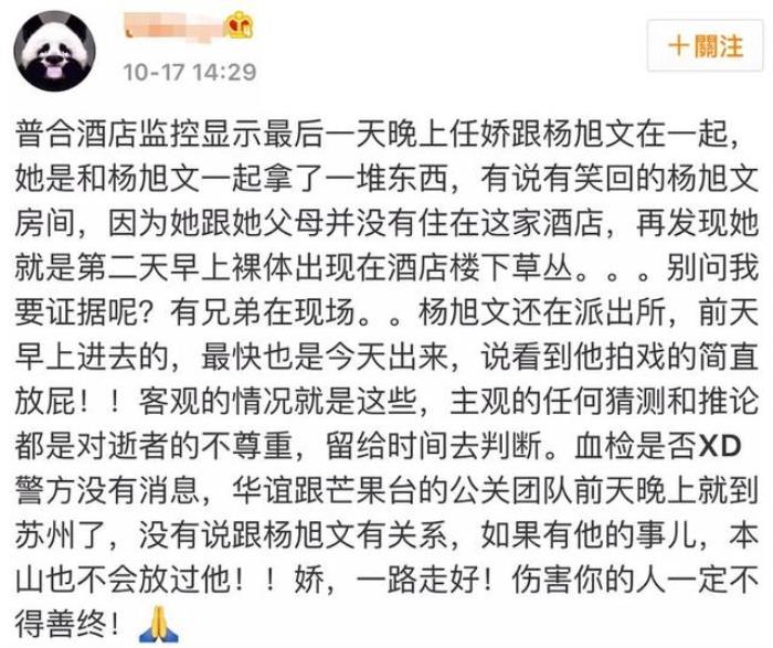 早在10月16日,曾有网友爆料称出演《钟馗伏魔:雪妖魔灵》、《半夜叫你别回头》、《恐怖将映》等多部影视作品的年轻女演员任娇跳楼身亡,引起网友广泛热议,更有爆料称任娇跳楼身亡与杨旭文有关。